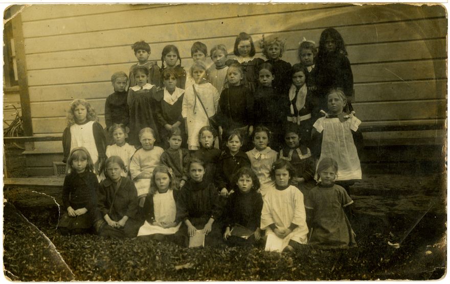 Jessie Irene Davis, born 1907, is identified as being 4th from the left in the 'centre row' (either 2nd or 3rd row). Jess was the daughter of James and Harriet Davis, who farmed in the Tiritea/Fitzherbert area until moving into Palmerston North c1910. Jess married Olaf Henrici and died in Wellington 1992.