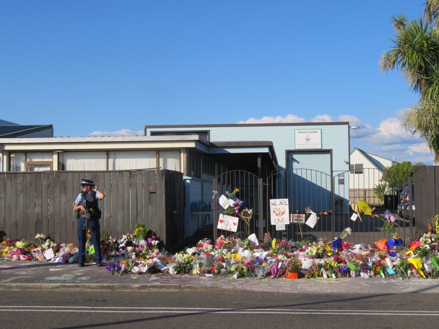 The footpath outside the Islamic Centre at 81 Cook Street, Palmerston North, covered in flowers, as a tribute to the victims of the Christchurch's terror attack on Friday 15 March 2019. At the time armed police guarded all mosques around New Zealand.