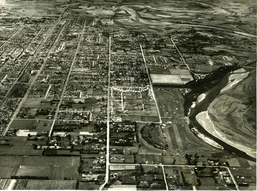 Taken from the south west, shows the Manawatu river on right. Of particular interest is the newly developed Savage Crescent state housing precinct, with distinctive street design. Houses began to be built there from 1937, through to the early 1940s.