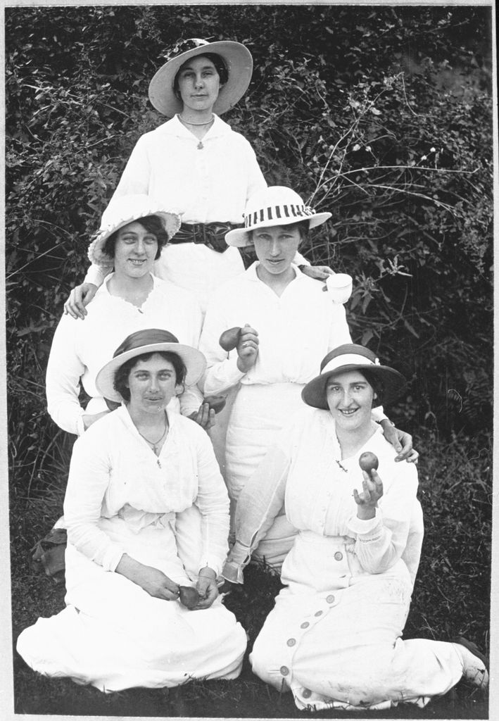 This photograph shows a group of young women dressed for a country picnic. The only identified figure is Mabel Child, nee Hocking, of Palmerston North who sits middle right. Mabel Child was born 1893 and judging on Mabel Child's appearance in this photograph, she is in her 20s. She died in 1975.