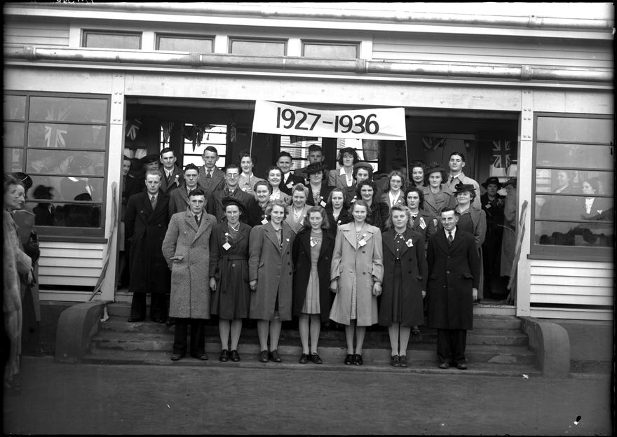 Pupils of Mangamaire Primary School from 1927 – 1936 pose under the banner on the steps of Mangimare School during the school reunion. The 50th jubilee celebration was an occasion to include the official opening of the new school, on 21 June 1947. The old school which had been vacated was given a new lease of life in 1949 when it was re-erected in the new school grounds to be used as an assembly hall. In the mid-1970s Mangamaire Country School combined with Marima, Hukanui, Hamua, Konini and Nikau schools.