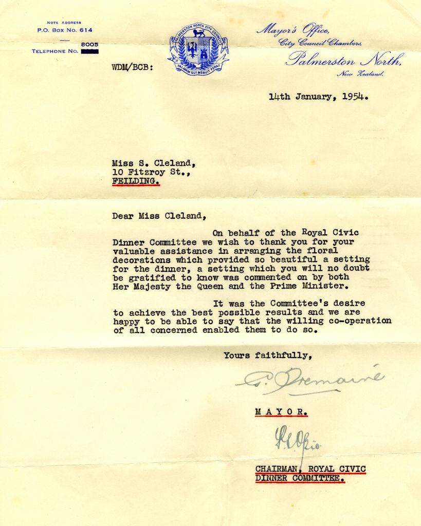 Letter of thanks from the Palmerston North City Council to Miss Shirley Cleland, regarding the Royal visit