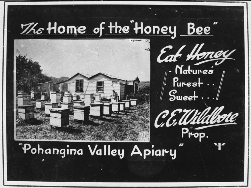 Mr Charles E Wildbore was a well-known resident of the Pohangina Valley frm about 1900 to 1920. He owned a small dairy farm and apiary at Pohangina Township, but he is principally remembered for his photographic activities, being an enthusiastic amateur photographer who recorded many interesteing views of rural life in the Pohangina Valley. See Pg35 and Pi172 for further details. This photograph shows an advertising poster designed and photographed by Mr Wildbore. The house in the photograph is said to be the Wildbore home.