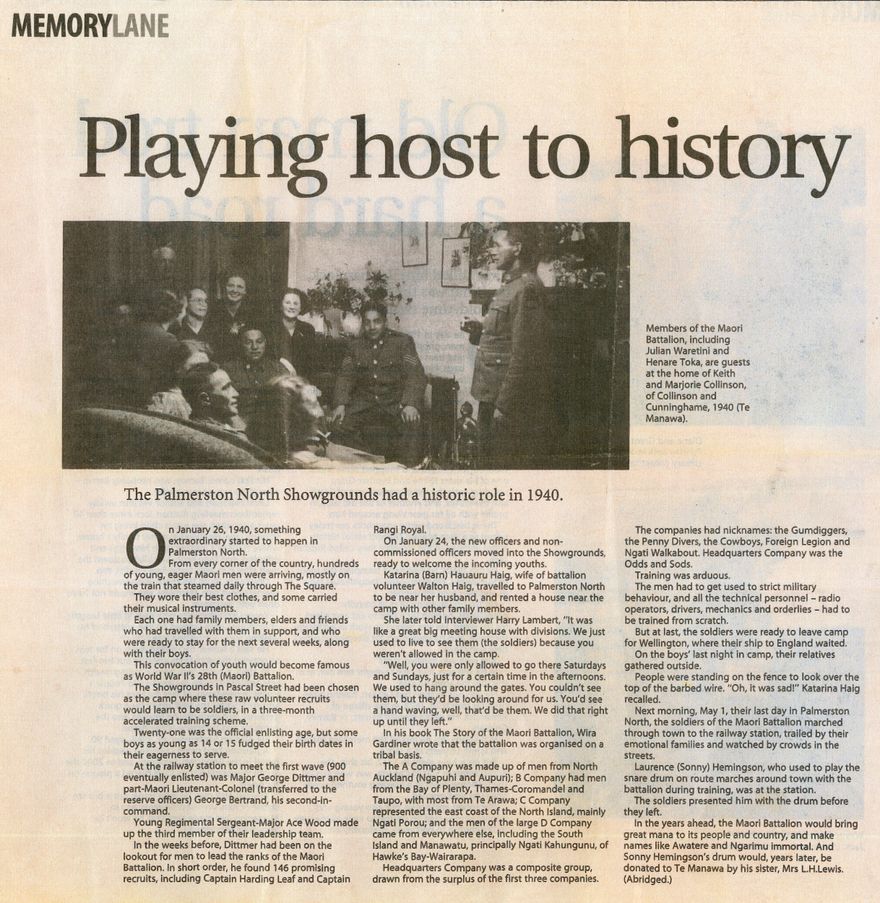 Journalist Tina White's weekly "Memory Lane" article in the Manawatū Standard. The Māori Battalion trains at the Palmerston North showgrounds in 1940. Abridged from original article, 22 April 2006.