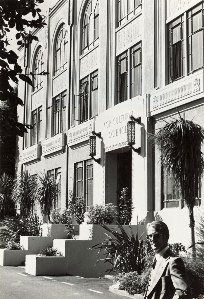 The Old Main Building of Massey Universtiy was the first major teaching and administrative block built for Massey Agricultural College, opening in 1929. In 1980 it underwent a restoration project, for which the Palmerston North architects, Walker, Love and Associates won a design award from the western branch of the Institute of Architects. To the right is Lloyd Love, architect in charge of the restoration.