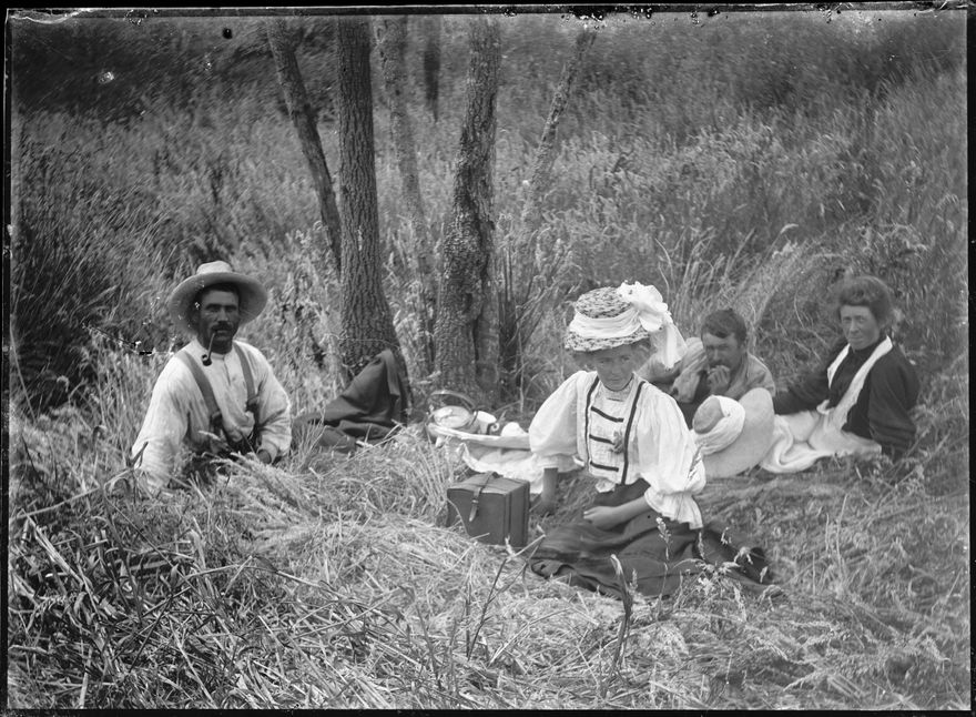 This photograph was created by William James Young in the early 20th century. A large variety of subjects are depicted in the collection, but family, rural life and travel are the most prominent themes. The exact location of the photographs in the Young Collection is unknown, but W J Young lived on a farm in Mt Stewart, Rangitikei, and some of the photographs include his house. The Young family were apparently avid travellers and photographs later in the collection feature scenes from Rotorua, Auckland, Whanganui, as well as other unidentified locations. The portraits are all unidentified, but are presumably of members of the Young family. The photographers parents were George Henry (b 1833) and Jane McDowell (b 1842, d 1916). They came to New Zealand in 1877. The same year, they bought the home farm on Mt Stewart and called it Kilrudden after Kilrudden House, the home of the McDowell family in Ireland. The couple had four children: Ann (b 1873), Margaret (b 1876), John (b 1878) and William James (b 1880). William James married Mary Elizabeth Thompson and they had four children: Doris (b 1914, d 1989), George (b 1916, d 1991), Royden McDowell (b 1925, d 1992) and Noel William (b 1927, d 2013).