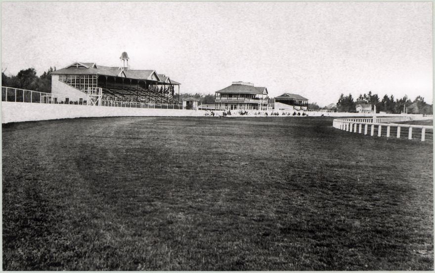 Awapuni Racecourse was the site of an army training camp during WW1. The text reads, "Photo taken on some previous occasion before we arrived. The large grandstand with small turret is where we are quartered - the front being covered with tarpaulins. The next building is our Headquarters from which the flag flies - that is where the officers have their quarters - the commandants office and the general office. The next - a smaller grandstand where we often assemble for lectures. The building further on is the caretaker's house. The course is in front of the picture. Jim."