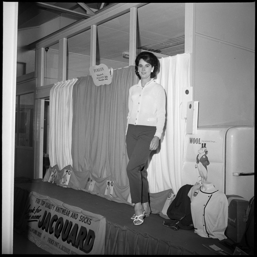 This image was not published in The Manawatu Evening Standard, taken on 30 January, 1964. [A woman models in a fashion show for visitors for the veterinary conference.] See also: 2017N_2017-20_018409, 2017N_2017-20_018411