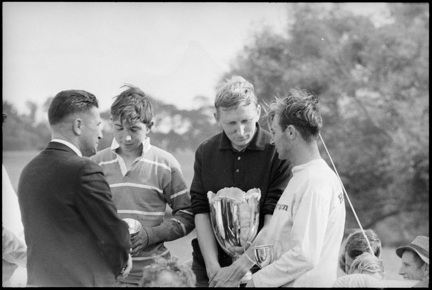This image was taken (but not used) for a story that ran in The Manawatu Evening Standard on 6th December 1965 "E. Underwood (England) leads the local rider K. Cleghorn in the early stages of the 1965 Gold Leaf International motocross race at Woodville, on Sunday."