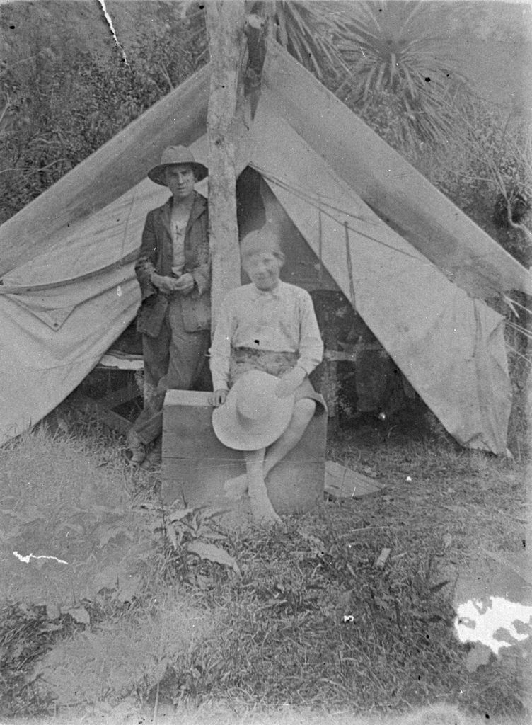 Alex and Oscar Oden, outside the tent they lived in with their parents, while their house ‘Valhalla’ was being built in Stoney Creek Road, Whakarongo, near Palmerston North.
