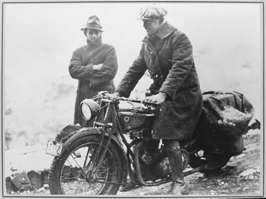 Archie Geves and Brian Bendall with an 'Indian' style motorcycle. Refer Fitzherbert East Aokautere School and District 1889-1989, p 23