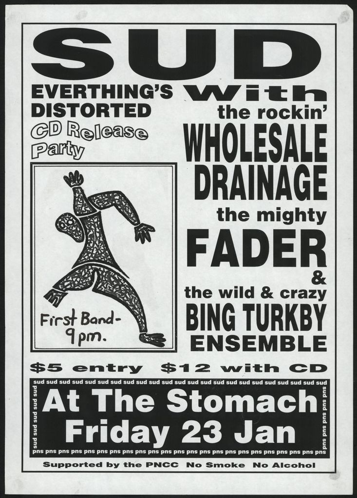 Sud. Everything's distorted CD party. With the rockin' Wholesale Drainage, the Mighty Fader & the wild and crazy Bing Turkby Ensemble. $5 entry $12 with CD. First Band- 9pm. At the Stomach Friday 23 Jan. Supported by PNCC No Smoke No Alcohol.
