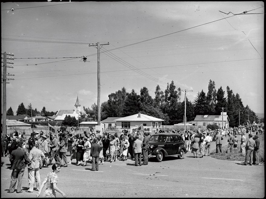 - Woodville Jubilee Procession at its starting point in Grey Street, Woodville. From the banners being held, it appears that groups from the Woodville Primary School reunion are marching in the procession.