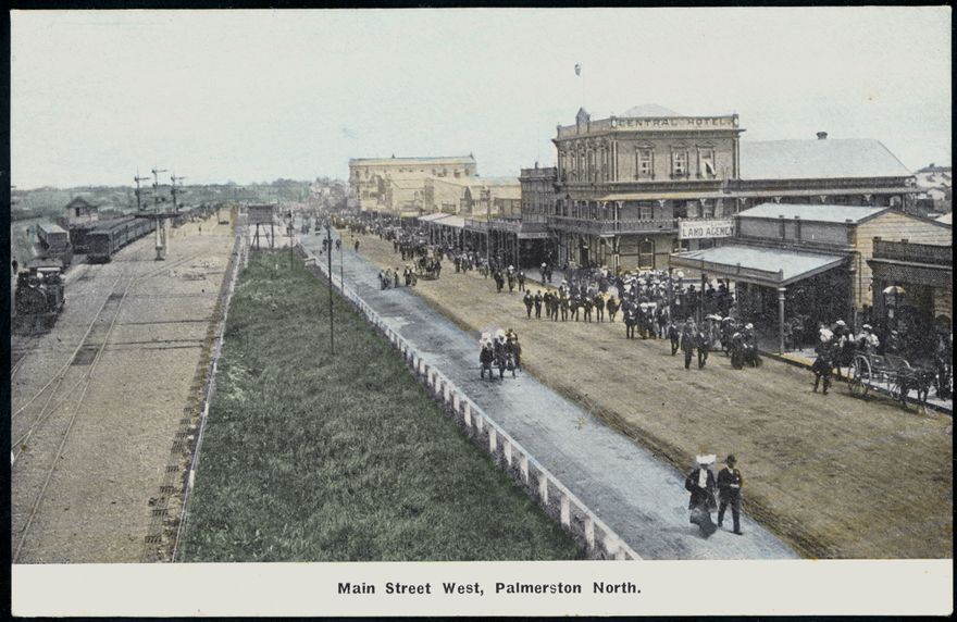 The only clearly distinguishable building in this postcard is the Central Hotel and the Manawatu Land Agency nearby. The Central Hotel was built in the 1890s on the corner of Andrew Young Street and Main Street (having relocated from The Square). The business continued until 1969. The other prominent feature is the railway yards, visible on the left.