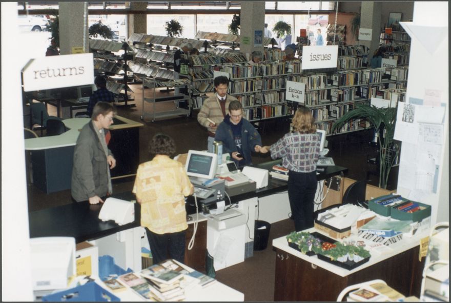 The issues and return area of the Palmerston North Public Library. Taken on the occasion of the millionth issue of a library item.