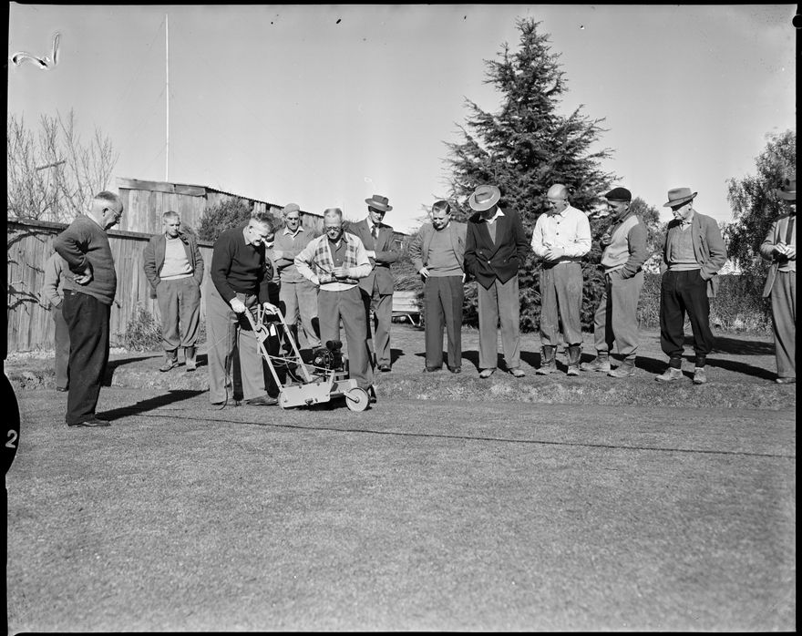 This image was taken for a story that ran in The Manawatu Evening Standard on 15 August 1960 "Greenkeepers from bowling and golf clubs were some of the interested persons who watched a demonstration on Saturday at the Hokowhitu bowling green of new methods in ground preparation."