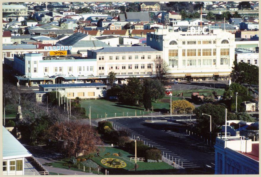 This photograph shows part of The Square that once included the Floral Clock and the Centennial Pavilion. The latter was a series of prefabricated buildings that sat opposite Main Street and the Commercial Hotel. The Centennial Pavilion was a meeting hall used by the community. When the City Council building were constructed, a room under the Council Chambers was incorporated for community use. It was closed in the mid 1980s.