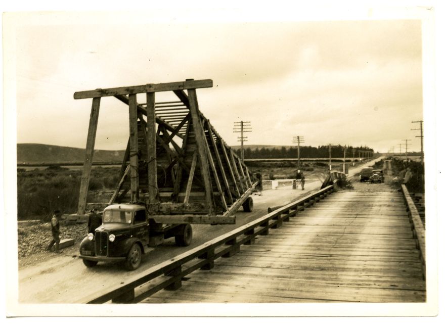 One of a group of photographs from Ron Grammer's working life in bridge engineering in the 1940s and 1950s. This bridge could be a different angle of the Fernhill Bridge over the Ngaruroro River in Hawkes Bay.
