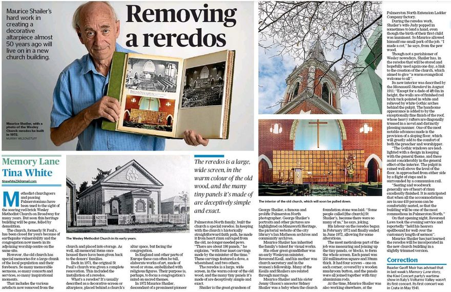 Journalist Tina White's weekly "Memory Lane" article in the Manawatū Standard. The origins of the soon-to-be demolished Wesley Methodist Church decorative alterpiece, also called a reredos. It was created almost 50 years ago by Maurice Shailer, descendant of a prominent pioneer Palmerston North family. The Shailer family have strong links with the church. The reredos is planned to be incorporated in a new church building.