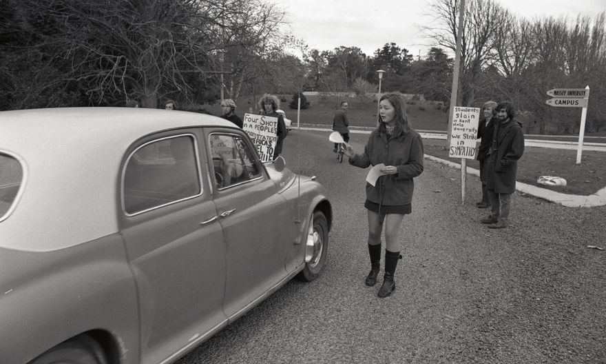 This image was taken (but not used) for a story that ran in The Manawatu Evening Standard on the 8th of May 1970. "These two Massey students are part of the groups which today picketed the university calling for a boycott of lectures to protest against the shooting of students at Kent University, Ohio. They are seen distributing leaflets to Motorists driving up to the university"