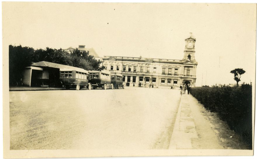 This photograph came from a small photograph album that belonged to Mrs R Andrews of Rangitikei House. This photograph bears the caption, "P.O. Palmerston North 14-1-28". The photograph is taken looking down one side of the railway line that used to run through The Square, with the Municipal Bus Depot to the left. Built in 1906, the Post Office on the corner of The Square and Main Street was Palmerston North’s fourth, and replaced a small wooden building on the same site. In 1988, when Telecom and Postbank became separate entities, the building ceased to be the Post Office. Though this building is still standing, the tower was removed in 1942 after the Napier earthquake. It currently operates as a restaurant and bar.
