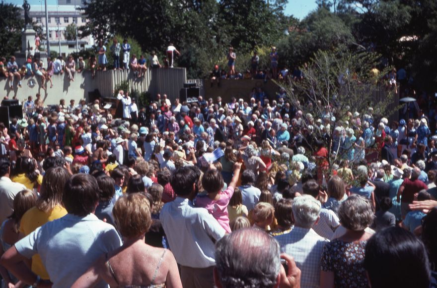 Her Majesty Queen Elizabeth II walking and greeting the crowds of people filling the "Lions Den" in the Square. Mayor Brian Elwood and other officials can be seen walking through the centre of the picture. A band and sound system are set up on the stage area.