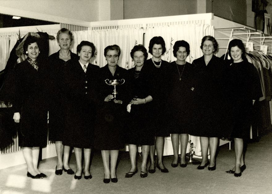 Staff of the women's fashion showroom posing with a trophy. From left: Molly Cotton; Miss Floyd; Mrs Boyle; Molly King; ?; Trish ?; Mrs Ciochetto; Peg McNabb; Gaye Chamberlain (later Ware). Gaye Ware was employed by C M Ross and Milne and Choyce between 1957-1963. Milne and Choyce was one of the foremost department stores of Palmerston North. The business was bought from C M Ross Co. Ltd in 1959 and was sold to the D I C in 1966.
