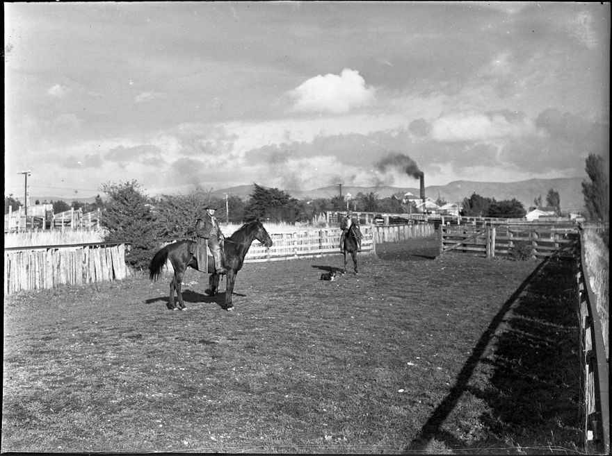 Men on horseback at yards near to the Freezing Works. The Longburn Slaughtering and Freezing Company Ltd was established as a farmer's co-operative in 1890. Sited at Longburn, just south of Palmerston North, it later became known as the Longburn Freezing Works. It closed in 1986.