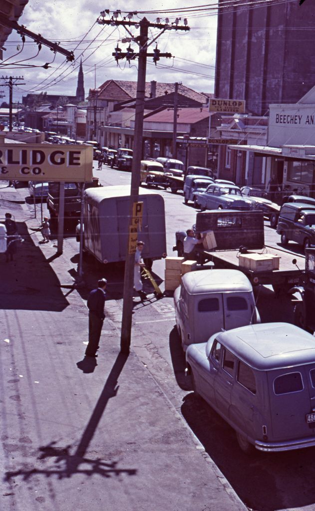 Photo taken by Terry Finnerty, photographer. King Street showing Arlidge Brothers and Company (produce auctioneers). On the opposite side, Agnew Refrigeration Ltd, Dunlop New Zealand Ltd and Beechey and Underwood Ltd (office equipment specialists) can be seen amongst other shops. In the distance is the steeple of St Patrick's Church on Broadway Avenue.