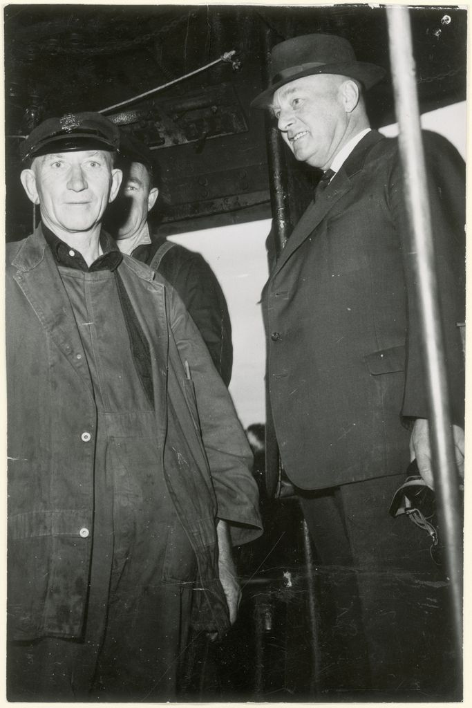The driver (left) is Mr W Eden. Bill Brown was MP for Palmerston North at the time.