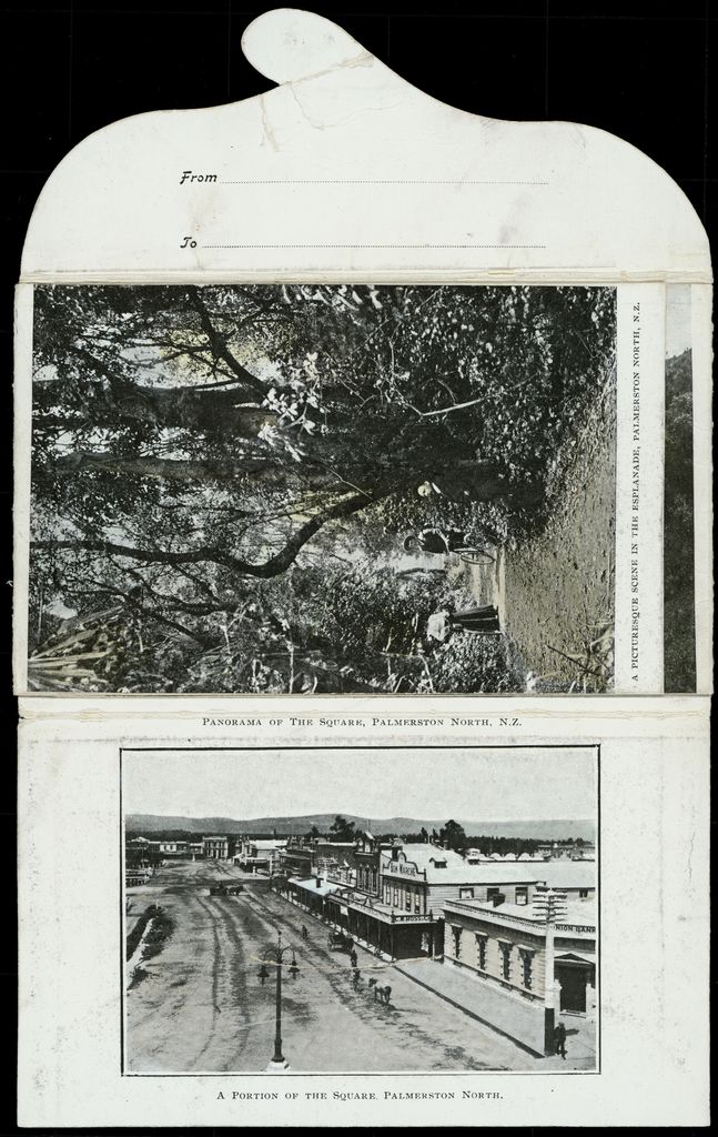 This postcard wallet shows a variety of Palmerston North views, including The Victoria Esplanade, a train going through the Manawatū Gorge, a panoramic view of The Square and the portion of The Square between Coleman Mall and Church Street West.