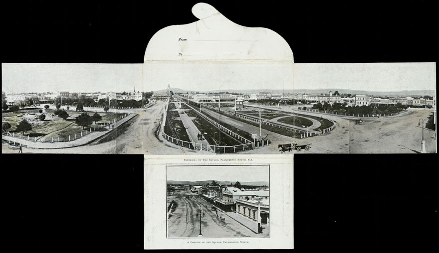 This postcard wallet shows a variety of Palmerston North views, including The Victoria Esplanade, a train going through the Manawatū Gorge, a panoramic view of The Square and the portion of The Square between Coleman Mall and Church Street West.