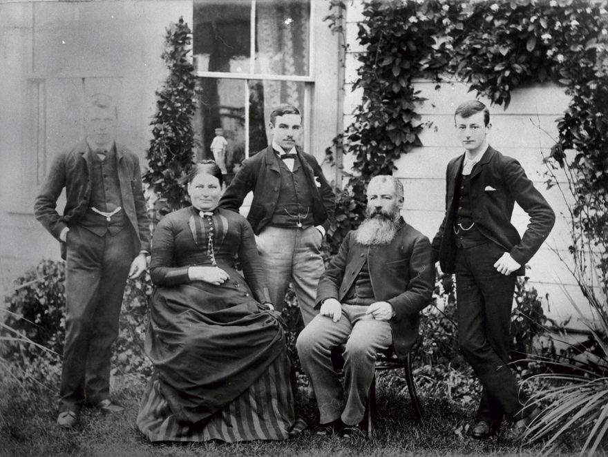 Mr and Mrs Snelson with boarders at their second home in Palmerston North, in Fitzherbert Avenue. From left: Mr E.T. Costello, standing, manager of the Bank of Australasia; Mrs Snelson, nee Louise Matilda Buck; Mr Boudrey, standing, connected with the first gas works in Palmerston North; Mr George Snelson, the first Mayor of Palmerston North; Mr George Harper, standing, worked in the Bank of Australasia and married Mrs Snelson’s niece, ‘Cissy’ McKenzie.