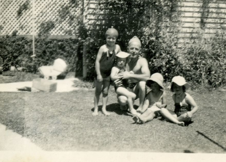 summer fun in the garden. Patricia Hayes (later Eaton), Diane Hayes, Thomas Hayes, Bruce Mitchell, Karen Richardson, at the Hayes family home, at 11 Anderson Street, Palmerston North.