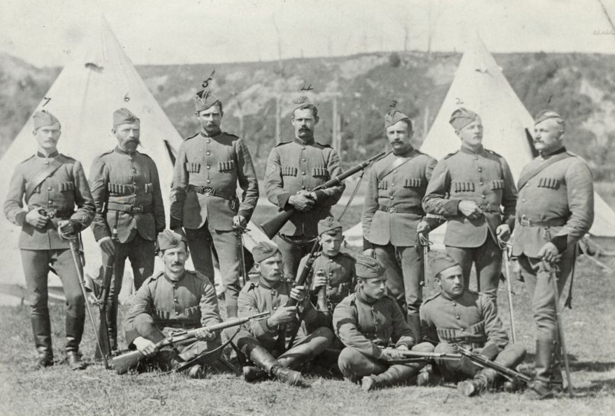 Back Row: L to R Sgt. James; Sgt Salmon; Sgt. – Maj Barnett; Cpl Wallace; lt. Pringle; QM Rockstraw; Capt. Dunk. Front Row: Sgt Innes; Cpl Matheson; Bugler Salmon; Cpl Monro; Sgt Bett. The Rifles are in camp, probably at Hokowhitu, although their usual location was near Foxton. The Manawatu Mounted Rifles were formed in 1891. Although this photograph is attributed to the Manawatu Mounted Rifles comparison to the Palmerston North Rifle Volunteer photographs proves more acurate.
