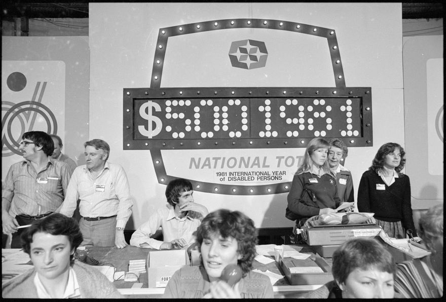 Telethon 1981 was for the International Year of Disabled Persons. Telethon was a 24-hour live television spectacular designed to raise money for charitable causes. It originated in the United States, but New Zealand put a typically Kiwi spin on the event. Local performers, amateur and professional were joined by international stars, who entertained New Zealand to raise money for charity. Groups of people from schools, clubs, and pubs, contributed cash and cheques, often in an oversized format, to add to the pledged totals on the day of the event.