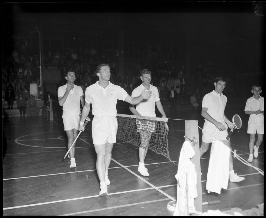 This image was taken for a story that ran in The Manawatu Evening Standard on 6 March, 1959. "The former American Davis Cup player and 1955 Wimbledon champion, Tony Trabert, waves to the crowd as he comes off the court after partnering Mervyn Rose (far left) in a convincing doubles win over Frank Sedgman and Ken Rosewall (far right) in the professional tennis stars exhibition in Palmerston North last night."