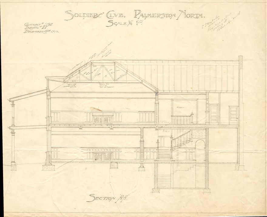 Cuba Street Elevation of the Soldiers' Club Building and created for the renovation of the building, dated 1945. Built on the corner of Cuba and George Streets for the Manawatu Patriotic Society and completed in 1917 to a design from the firm of L G West & Son. The building was used by the Returned and Services Association until 1966 when it was sold to a private owner. Currently it houses Cafe Cuba on the ground floor whose outdoor tables can be seen occupying the footpath along Cuba Street. The building is well preserved and contains many of the original design features including cast iron columns along the verandah.
