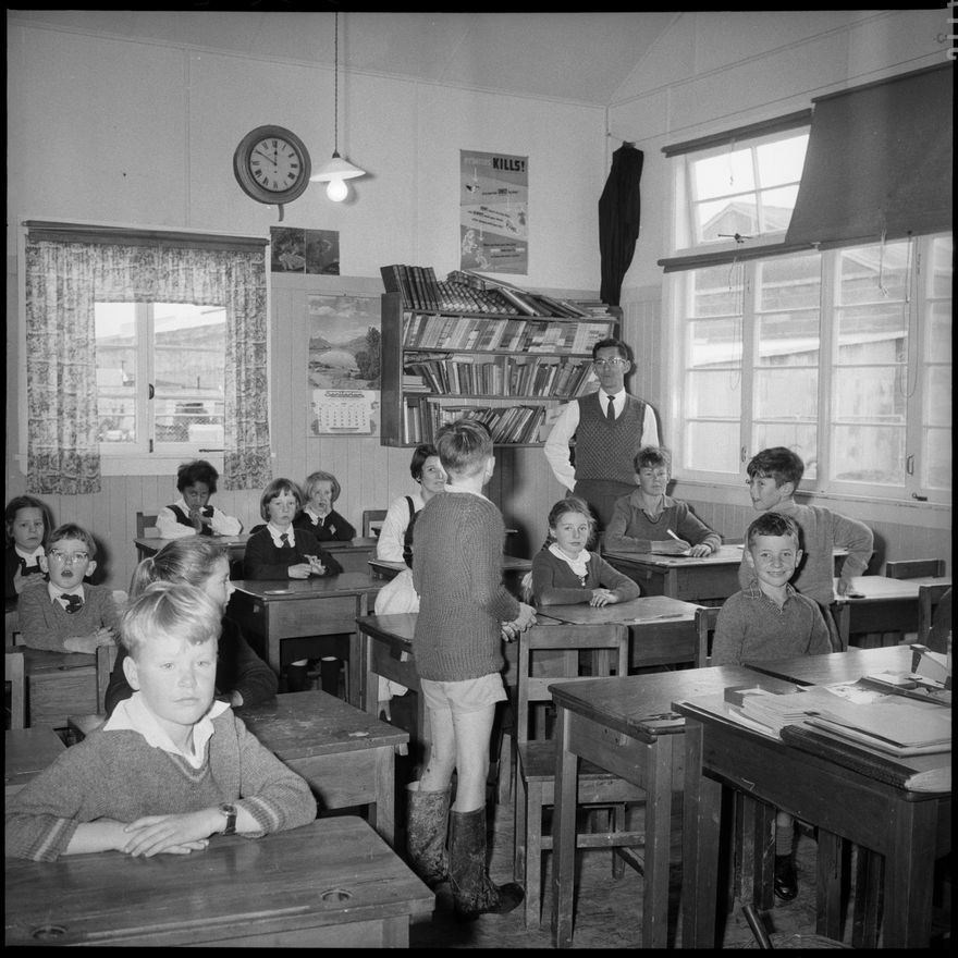 [A teacher stands at the back of his classroom while a student stands and speaks. The rest of the class looks on.]
