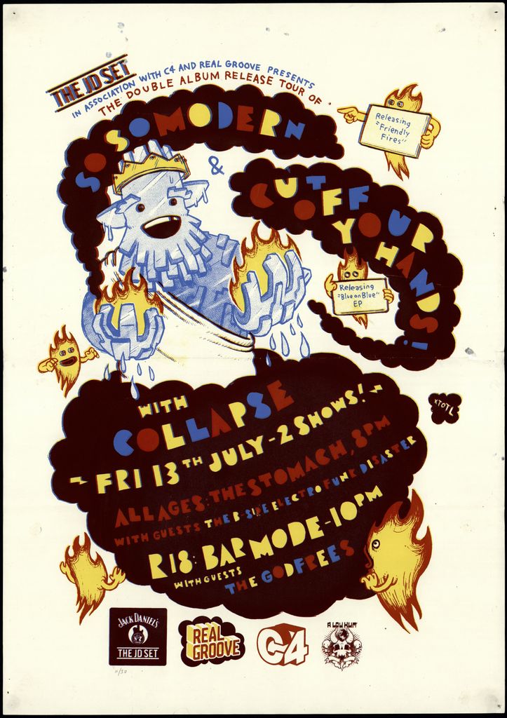 The JD set. In association with C4 and Real Groove presents the double album tour of So So Modern, releasing "Friendly Fires". And Cut Off Your Hands, releasing "Blue on Blue" EP. With Collapse. Fri 13th July - 2 shows!. All Ages : The Stomach 8pm. With guests The B Side Electro Funk Disaster. R18 Barmode -10pm. With guests The Godfrees. Part of a collection of posters that were displayed at The Stomach, Lombard Street, venue for Creative Sounds Society Incorporated.