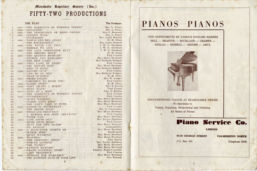 The programme from the play "Dear Octopus" by Dodie Smith. The play was performed by the Manawatū Repertory Society at the Palmerston North Opera House on July 19-22, 1952. The play marked the society's 21st birthday. The programme contains an illustration of Repertory House, the theatre company's home base. The house, converted into a small theatre, stood on the corner of Princess and Church Streets. It was used for smaller productions, one-act play nights, play readings and rehearsals.