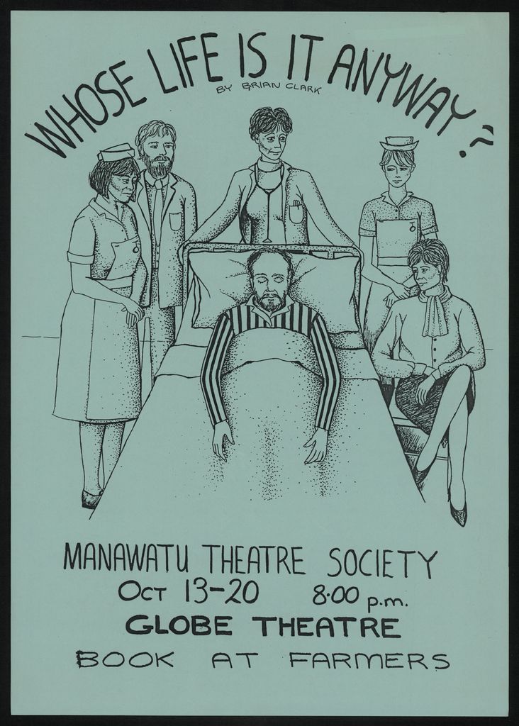 "Whose Life is it Anyway? By Brian Clark. Manawatu Theatre Society. Oct 13-20. 8.00p.m. Globe Theatre. Book at Farmers." Part of a collection of posters that were displayed in the Public Library in the 1970s - 1980s.