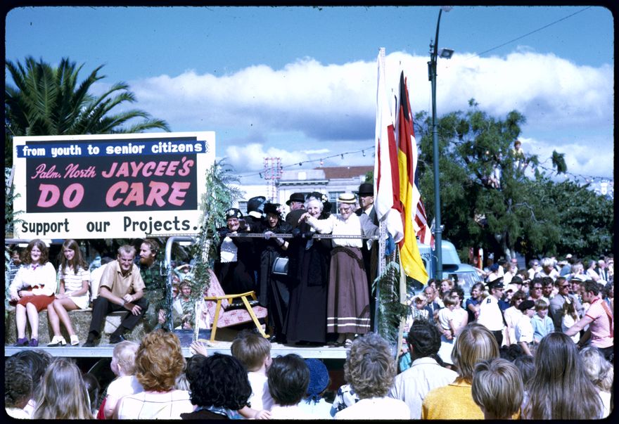 The sign on this float reads, "From youth to senior citizens Palm North Jaycee's DO CARE. Support our projects." 92 floats took part at the Palmerston North City Centennial celebrations of 1971. Approx. 10,000 people were present at the event to celebrate 100 years of Palmerston North.