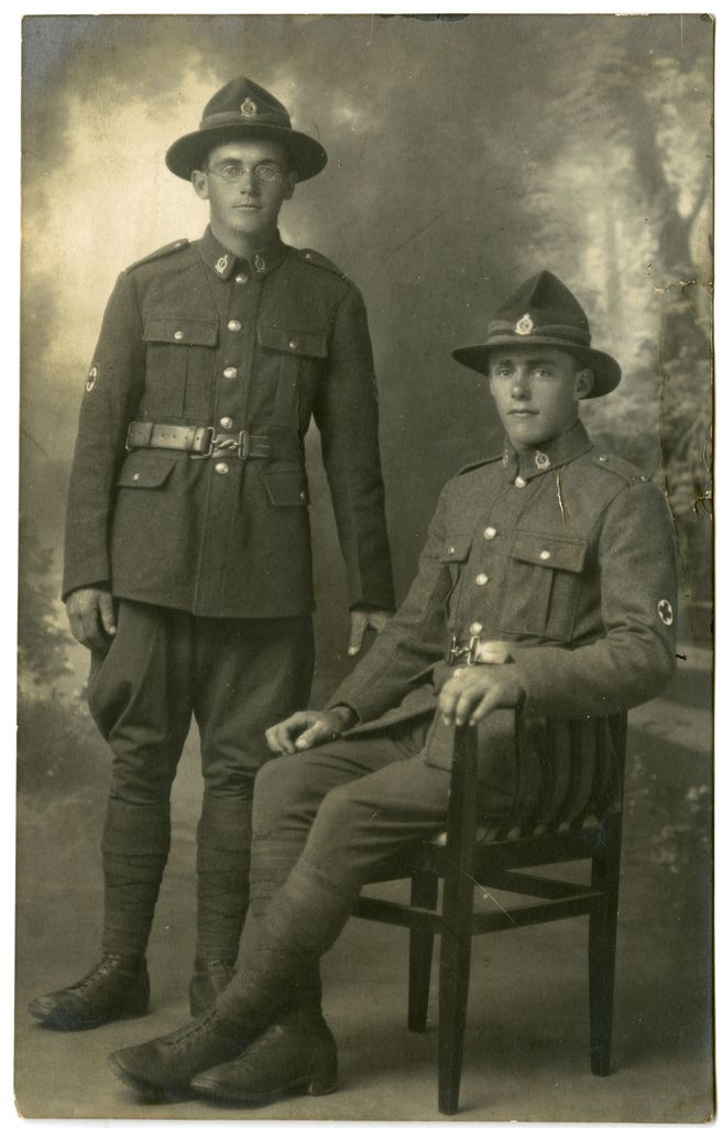 A studio portrait of two New Zealand soldiers in uniform, both wearing Red Cross insignia. The man standing on the left is Private Edwin Ward (75133), who served with the New Zealand Medical Corps, 39th Reinforcements, from March 1918 until October 1919. The seated man may be his brother George Bowman Ward (83583), who enlisted in September 1917 and was discharged on medical grounds in September 1918. Both men were brothers of Henry Ward whose descendants supplied these photographs.