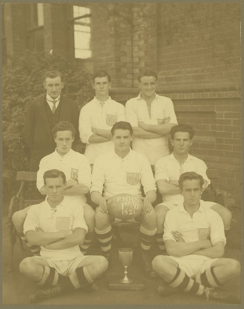 The players on this team are unidentified. Palmerston North High School was the first secondary school in Palmerston North, built in Featherston Street 1902. It was destroyed by fire in April 1910 and replaced in 1911. The school separated into boys and girls high schools in 1919, with a purpose built facility for girls opening September 1920.