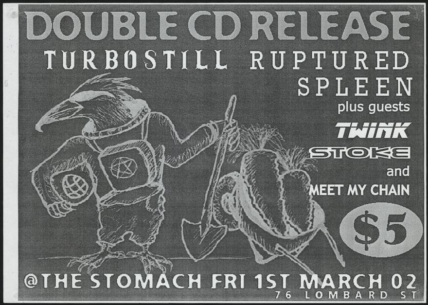 Double CD Release. Turbostill, Ruptured Spleen. Plus guests Twink, Stoke and Meet My Chain. $5. @ The Stomach Fri 1st March 02. 76 Lombard St.