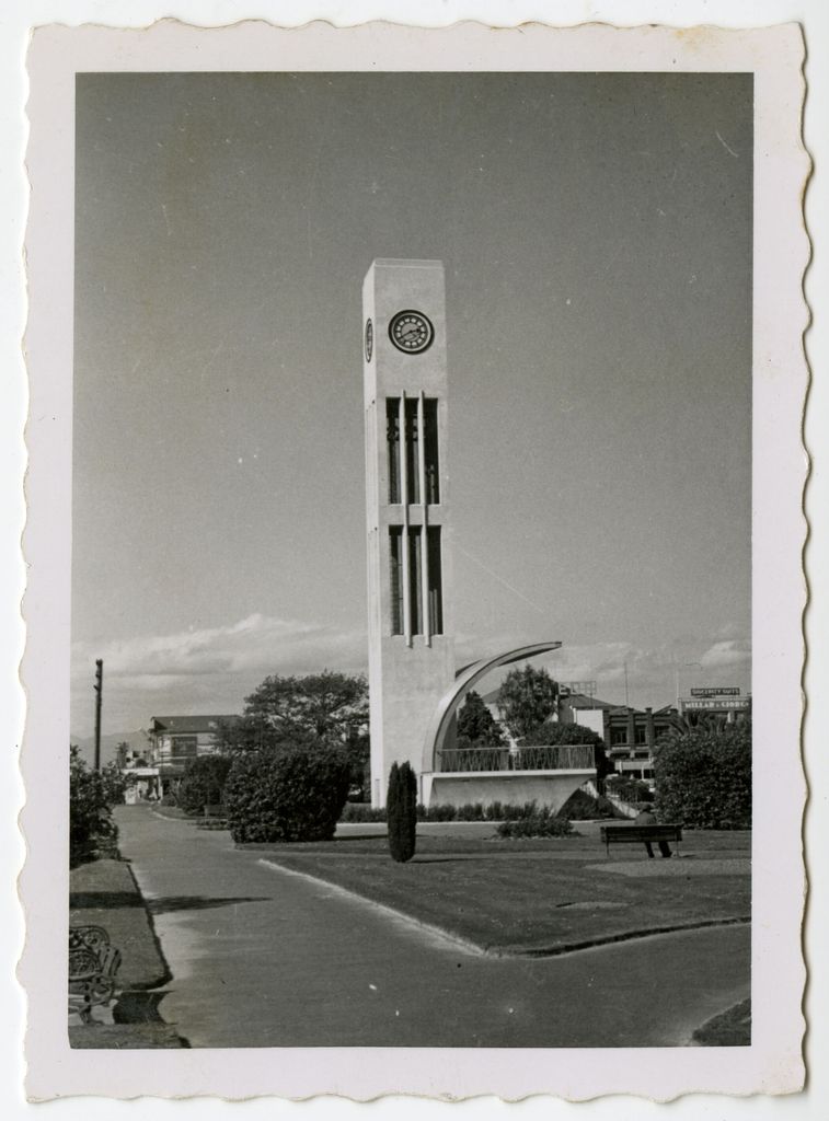 The clock tower was constructed with money donated from Arthur Hopwood, a Palmerston North businessman. It was completed in 1957, and utilised the clock from the Post Office tower, which had been dismantled after the 1942 Waiararapa Earthquake. The sound shell is no longer part of the structure, being dismantled sometime in the 1990s.