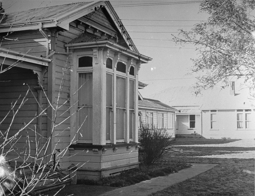 Rostrata, photographed just prior to its demolition (June 1973). Situated on the corner of Ruahine and Ferguson Streets, Rostrata was owned by E B Watson who ran it as a private maternity hospital for many years. Mrs E Dujany later held the lease until 1949. The Palmerston North Hospital Board took over maternity services until 1962, when Rostrata was closed due to the Palmerston North Hospital adding 40 more beds to its Maternity section. In the 13 years that the board had Rostrata, there were 6119 patients and 5230 births. The 1973 owner converted the building into flats from the original two houses joined by annexes on the one acre section. The old trees, including a large Australian red gum will remain.