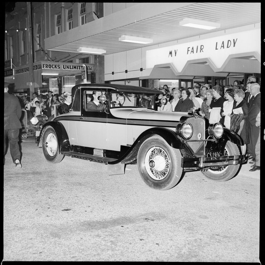 [Image of a vintage car delivering costumed guests to the opening of the renovated Odeon Theatre. Costumes were inspired by the film "My Fair Lady" which was the show on opening night.]