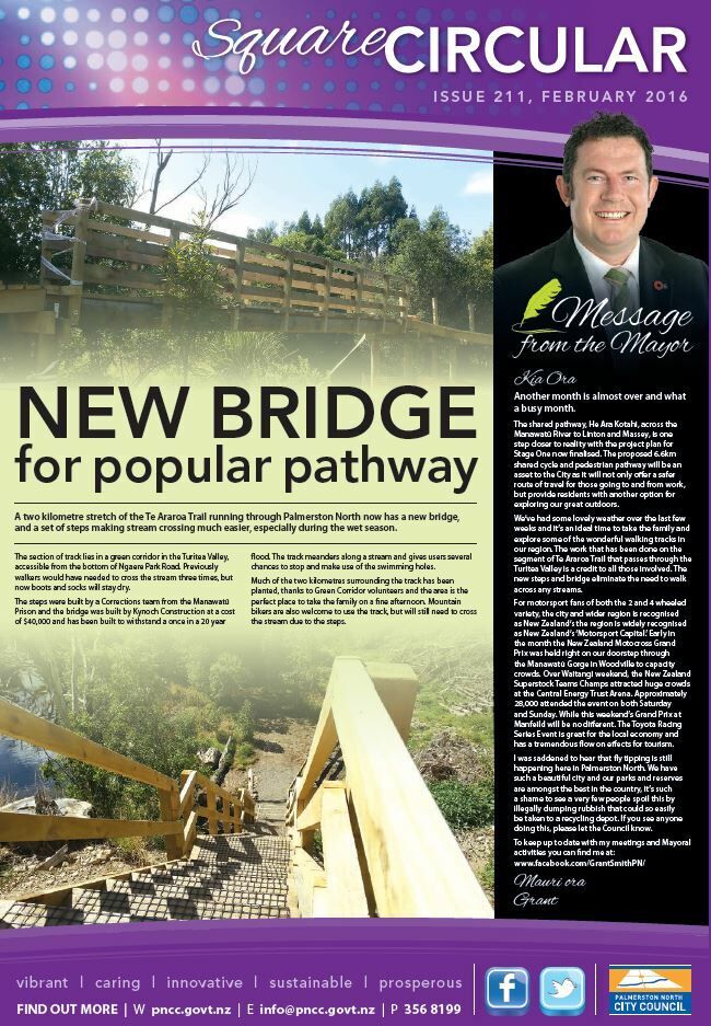 The Square Circular was Palmerston North City Council's monthly community publication, informing Palmerstonians of PNCC initiatives, activites, and events. This month's issue includes: Bridge; Grant Smith; waste minimisation; civil defence; Green Corridors; Ashhurst Domain; Linton shared pathway; rubbish; election signage; councillor contact details; council meetings.